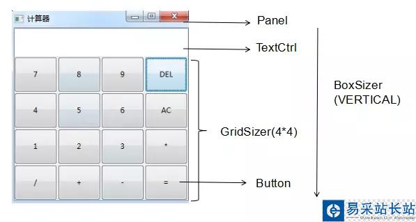 self.buttonData="7 8 9 DEL 4 5 6 AC 1 2 3 * / + - =".split() #產生buttonIterm的label #將label分配到按鈕上去 buttonLength=len(self.buttonData) for i in range(buttonLength): labels="%s" %self.buttonData[i] buttonIterm = wx.Button(panel,i,labels) self.createHandler(buttonIterm,labels) gridBox.Add(buttonIterm,0,flag=wx.EXPAND)