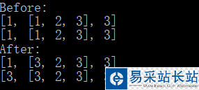 #!/usr/bin/env python3 # -*- coding: utf-8 -*- old = [1, [1, 2, 3], 3] new = old print('Before:') print(old) print(new) new[0] = 3 new[1][0] = 3 print('After:') print(old) print(new)運行結果: