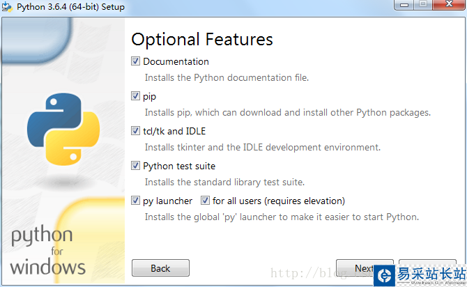 5. 選擇Customize installation后,這一步默認全選,然后點擊next(這里看到我是真的選了下載pip的,后來不知道為什么沒有下載,導致我的入門遇到頂級災難o(╥﹏╥)o)
