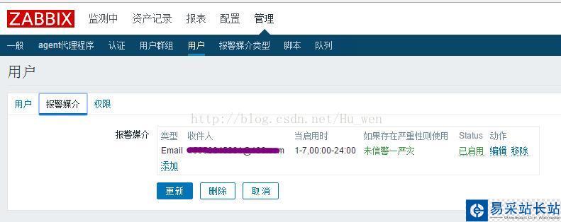 配置用戶,修改報(bào)警媒介,填寫收件人郵箱,選擇發(fā)送郵件告警類型。
