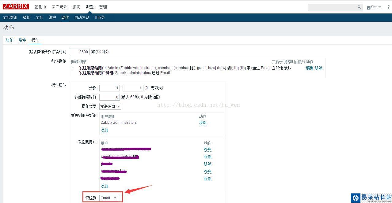 在配置-動(dòng)作-操作中,send only to 中選擇剛剛建立的send.py這個(gè)媒介類型