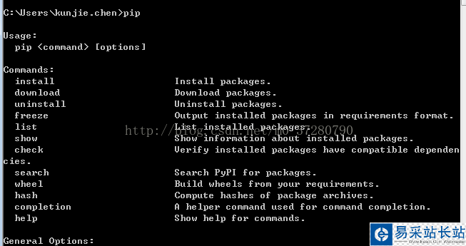 6、打開CMD界面【不是Python自帶的編輯器】 ,輸入“Pip”,顯示一系列指令,則說明安裝ok;如果顯示不是內(nèi)部或外部命令,則說明你現(xiàn)在還要手動(dòng)加一下環(huán)境變量。