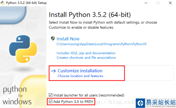 2.1 運行exe安裝程序,勾選“Add Python 3.5 to PATH”,然后選擇“Customize installation”自定義安裝