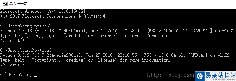 在命令行窗口輸入python2,python3 可以看到成功運行對應的python版本: