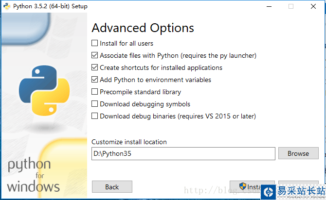 2.3 點擊“Next”,選擇安裝路徑,這里我選擇的是D:/Python35