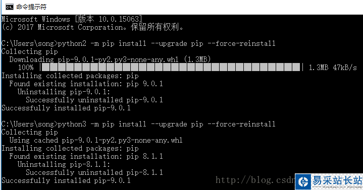 在修改python.exe名后,我們需要強制重新安裝一下pip。