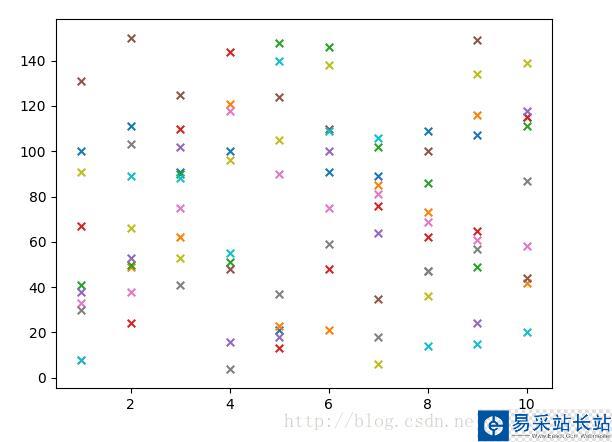 #!usr/bin/env python#encoding:utf-8 '''__Author__:沂水寒城功能:折線圖、散點(diǎn)圖測(cè)試''' import randomimport matplotlib import matplotlib.pyplot as plt def list2mat(data_list,w): ''' 切片、轉(zhuǎn)置 ''' mat=[] res=[] for i in range(0,len(data_list)-w+1,w): mat.append(data_list[i:i+w]) for i in range(len(mat[0])): one_list=[] for j in range(len(mat)): one_list.append(mat[j][i]) res.append(one_list) return res def draw_pic_test(): ''' 作圖 ''' data_list=[] for i in range(100): data_list.append(random.randint(2,150)) month_list=range(1,11,1) mat=list2mat(data_list,w=10) for one_list in mat: one_list=[int(one) for one in one_list] plt.plot(month_list,one_list,"x-",label="test_zhexian") plt.savefig('test_zhexian.png') plt.close() for one_list in mat: one_list=[int(one) for one in one_list] plt.scatter(month_list,one_list,marker='x',label='test_sandian',s=30) plt.savefig('test_sandian.png') plt.close() if __name__ == '__main__': draw_pic_test()結(jié)果如下: