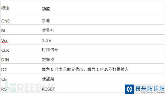 LCD5110 顯示屏共有8個引腳,不同的板子可能標注的英文略有不同,具體參照如下: