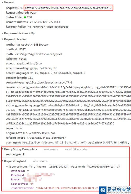 可以發現,登錄的請求地址是: https://wechatx.34580.com/sz/Sign/SignInV2,并且會在請求時帶著登錄信息 :