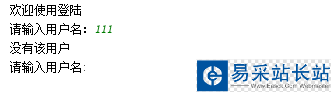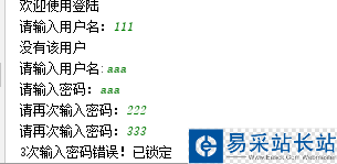 import text #text為文件名:text.py 用來實現文件驗證print("歡迎使用登陸")username = input("請輸入用戶名:")while text.CheckUsername(username)==-1: username = input("沒有該用戶/n請輸入用戶名:")else: n=text.CheckUsername(username) password = input("請輸入密碼:") text.CheckUser(n,password)文件驗證代碼: