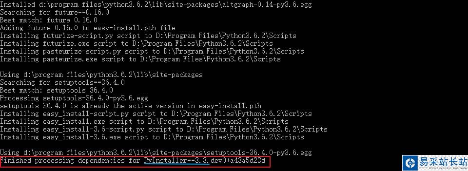 并按下回車鍵,會看到代碼迅速執行,會進行安裝pyinstaller,顯示如下狀態,看到“Finished processing dependencies for PyInstaller==3.3.dev0+41c426f6d”,即安裝成功: