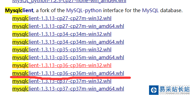 搜索mysqlclient找到對應(yīng)的文件,我使用的是python3.6電腦是64位的,就找到對應(yīng)的whl文件下載到本地。