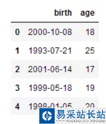 在這里使用了dt.datetime.today().year來獲取當前日期的年份,然后將birth數據中的年份數據提取出來(frame.birth.dt.year),兩者相減就得到需要的年齡數據,如下: