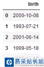 # -*- coding: utf-8 -*-import pandas as pdfrom pandas import Series, DataFrameimport numpy as npimport seaborn as snsimport matplotlib.pyplot as plt %matplotlib inlinedata = {'birth': ['10/8/00', '7/21/93', '6/14/01', '5/18/99', '1/5/98']}frame = DataFrame(data)frame