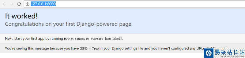 創建后運行項目,默認頁面為http://127.0.0.1:8000/,打開后: