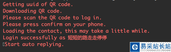 然后就可以把我們的微信掛在后臺(tái)自動(dòng)回復(fù)了。注意運(yùn)行的時(shí)候獲取一下自己的微信名,以便用來判斷消息是不是自己發(fā)出的。