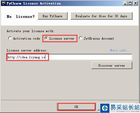 之后在License server address中隨意輸入下面兩個注冊碼中的任意一個即可,Pycharm新注冊碼1:http://idea.liyang.io或pycharm新注冊碼2:http://xidea.online,之后點擊OK,便可以激活Pycharm了。