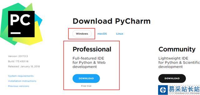 1、首先去Pycharm官網(wǎng),或者直接輸入網(wǎng)址:http://www.jetbrains.com/pycharm/download/#section=windows,下載PyCharm安裝包,根據(jù)自己電腦的操作系統(tǒng)進行選擇,對于windows系統(tǒng)選擇下圖的框框所包含的安裝包。