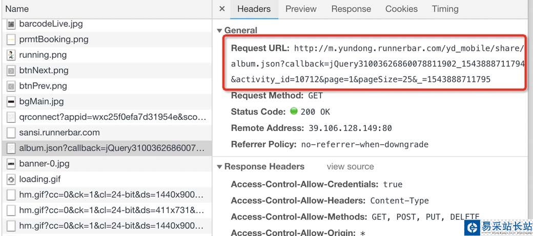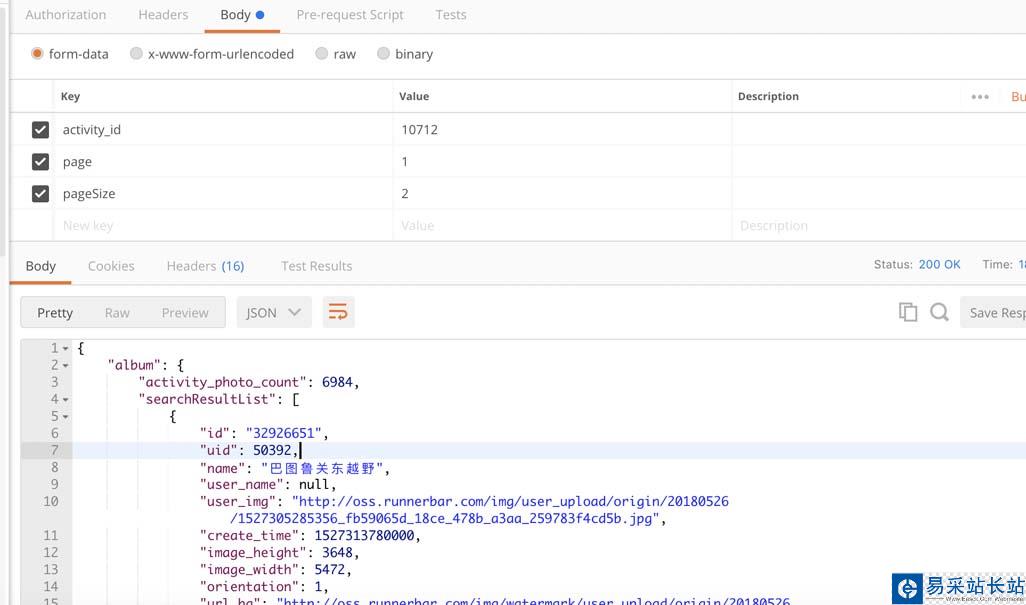 {"album": { "activity_photo_count": 6984, "searchResultList": [ { "id": "32926651", "uid": 50392, "name": "巴圖魯關(guān)東越野", "user_name": null, "user_img": "http://oss.runnerbar.com/img/user_upload/origin/20180526/1527305285356_fb59065d_18ce_478b_a3aa_259783f4cd5b.jpg", "create_time": 1527313780000, "image_height": 3648, "image_width": 5472, "orientation": 1, "url_hq": "http://oss.runnerbar.com/img/watermark/user_upload/origin/20180526/1527313783392_235c5cea_5d0c_4cd7_afc6_0ba37cdc7c1d.jpg?quality=h", "url_lq": "http://oss.runnerbar.com/img/watermark/user_upload/origin/20180526/1527313783867_7d986351_fde4_418a_8fb3_1723dcb38aec.jpg", "content": null, "is_like": 0, "like_count": null, "comment_count": 0 }}這是個(gè)json格式,最外層里有個(gè)album元素,album里包含了圖片總數(shù)量activity_photo_count和圖片信息的數(shù)組searchResultList。每張圖片包含了id、uid、user_img、create_time等等,和圖片路徑相關(guān)的有三個(gè)值分別是user_img、url_hq、url_lq,其中的user_img打開(kāi)后發(fā)現(xiàn)是賽事的宣傳logo,剩下的url_hq、url_lq根據(jù)命名就很容易猜想到這是對(duì)應(yīng)的兩種尺寸的圖片,用瀏覽器分別打開(kāi),果不其然正是想要的圖片路徑。