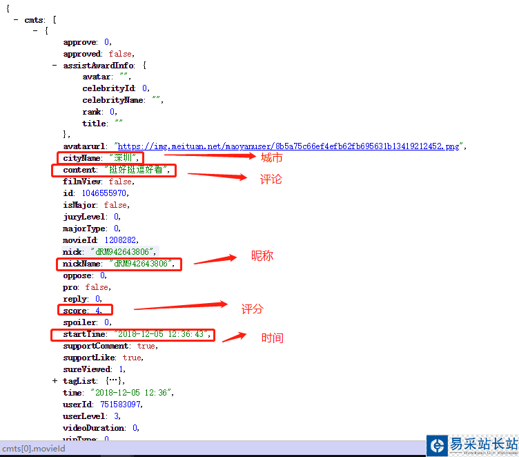 接口返回的數(shù)據(jù)如下,主要采集(昵稱、城市、評論、評分和時間),用戶評論在 json['cmts'] 中: