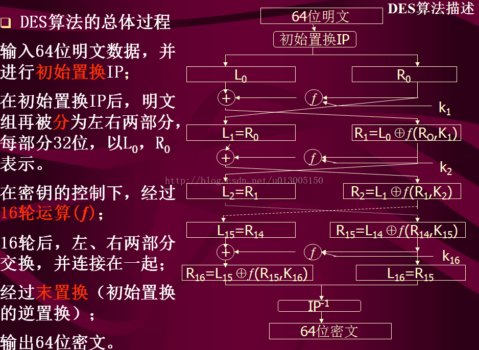DES對(duì)64位的明文分組進(jìn)行操作。通過(guò)一個(gè)初始置換,將明文分組分成左半部分和右半部分,各32位長(zhǎng)。然后進(jìn)行16輪完全相同的運(yùn)算,這些運(yùn)算被稱為函數(shù)f,在運(yùn)算過(guò)程中數(shù)據(jù)與密鑰結(jié)合。經(jīng)過(guò)16輪后,左、右半部分合在一起,經(jīng)過(guò)一個(gè)末置換(初始置換的逆置換),這樣該算法就完成了。