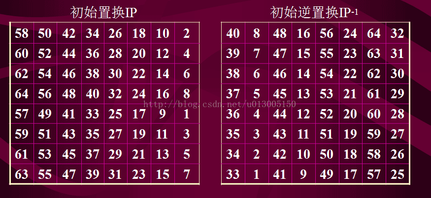 IP置換作用于進(jìn)行16輪f函數(shù)作用之前,IP逆置換作用于16輪f函數(shù)作用之后。IP置換和IP逆置換表如下圖所示: