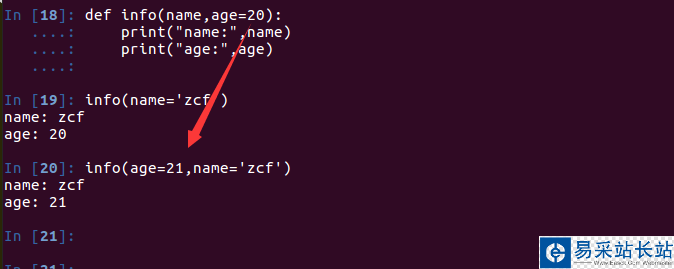 In [18]: def info(name,age=20): ....: print("name:",name) ....: print("age:",age) ....: In [19]: info(name='zcf')name: zcfage: 20In [20]: info(age=21,name='zcf')name: zcfage: 21