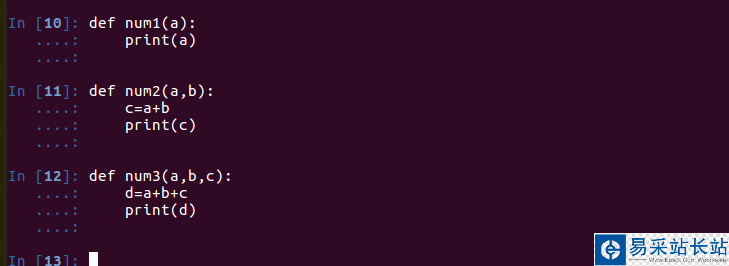 In [10]: def num1(a): ....: print(a) ....: In [11]: def num2(a,b): ....: c=a+b ....: print(c) ....: In [12]: def num3(a,b,c): ....: d=a+b+c ....: print(d)