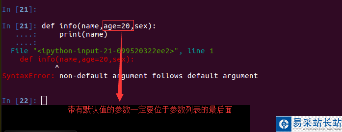 In [21]: def info(name,age=20,sex): ....: print(name) ....: File "<ipython-input-21-099520322ee2>", line 1 def info(name,age=20,sex): ^SyntaxError: non-default argument follows default argument