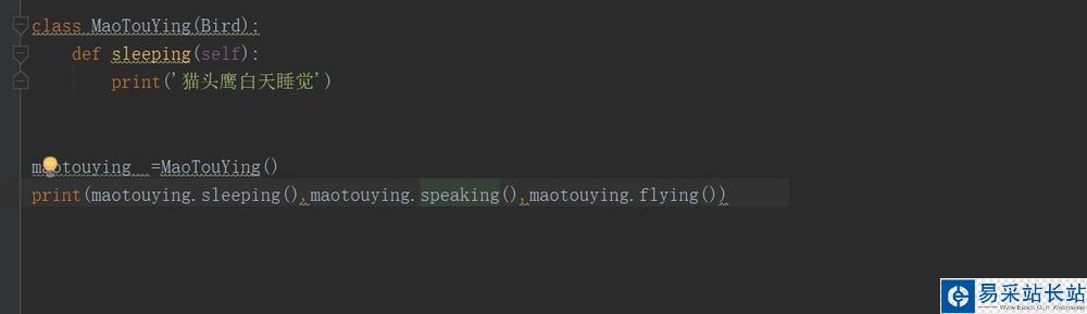 class MaoTouYing(Bird): def sleeping(self): print('貓頭鷹白天睡覺maotouying =MaoTouYing()print(maotouying.sleeping(),maotouying.speaking(),maotouying.flying())輸出結(jié)果: