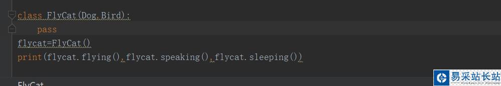 class FlyCat(Dog,Bird): passflycat=FlyCat()print(flycat.flying(),flycat.speaking(),flycat.sleeping())