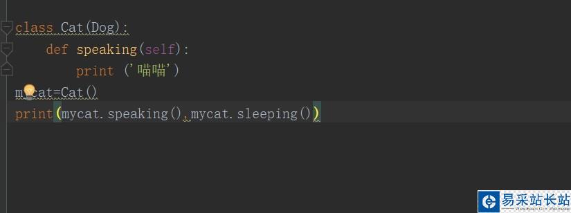 class Cat(Dog): def speaking(self): print ('喵喵')mycat=Cat()print(mycat.speaking(),mycat.sleeping())輸出: