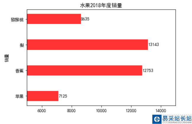 # 導入繪圖模塊import matplotlib.pyplot as plt# 構建數據sales = [7125,12753,13143,8635]# 中文亂碼的處理plt.rcParams['font.sans-serif'] =['SimHei']plt.rcParams['axes.unicode_minus'] = Falsex = ['蘋果','香蕉','梨','獼猴桃']# 繪圖plt.barh(range(4), sales, 0.4,color='r', alpha = 0.8)# 添加軸標簽plt.ylabel('銷量')# 添加標題plt.title('水果2018年度銷量')# 添加刻度標簽plt.yticks(range(4),['蘋果','香蕉','梨','獼猴桃'])# 設置Y軸的刻度范圍plt.xlim([5000,15000])# 為每個條形圖添加數值標簽for x,y in enumerate(sales): plt.text(y+0.2,x,'%s' %y,va='center')# 顯示圖形plt.show()效果圖: