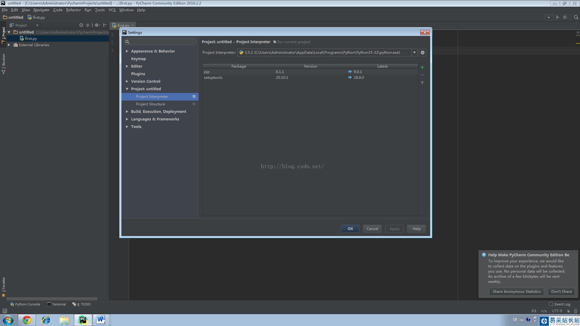 首先我們進入pycharm的主界面,單擊file-〉settings-〉Project:untitled-〉Project Interpreter,如下圖: