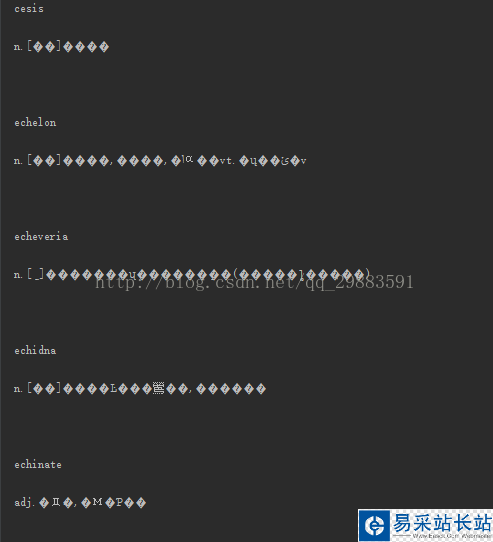 我們隨意拿出這句'runlet/n', 'n./xcd/xb0,/xd0/xa1/xba/xd3/n', '/n', 'runnel/n', 'n./xd0/xa1/xba/xd3,/xcf/xb8/xc1/xf7/n', '/n',從中可以看出,對于每行的文件,在讀取的時候,換行符“/n”也是會被讀取在單詞和對應的解釋的后面的,所以這也就是為什么會有那么多空行的原因了,這顯然不是我們想要看見的,下面我們處理一下,讓這些多余的空行失去效果: