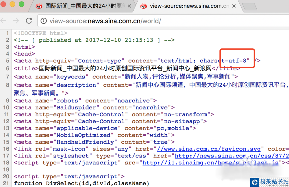 4、怎么處理亂碼呢?我們可以拿瀏覽器打開網頁,右鍵查看網頁源代碼,我們可以看到編碼格式為utf-8