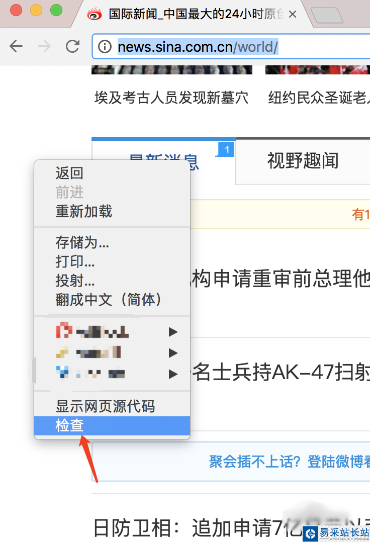 6、拿到數據之后,我們需要先分析數據,看我們想要的數據在哪里,我們打開瀏覽器,右鍵審查,然后按示例圖操作,就可以看到我們新聞所在的標簽,假如是windows系統,選擇開發中工具里面一樣