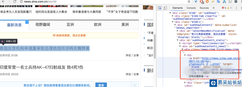 8、我們想要拿到新聞的具體標題,時間,地址,就需要我們在對元素進行深入的解析,我們還是按之前的方法,找到標題所在的標簽