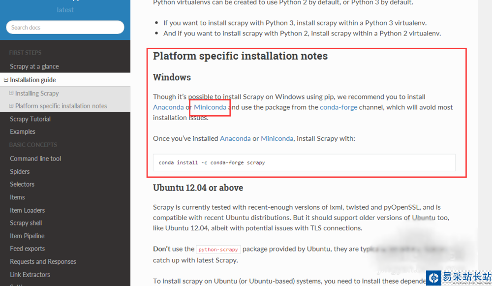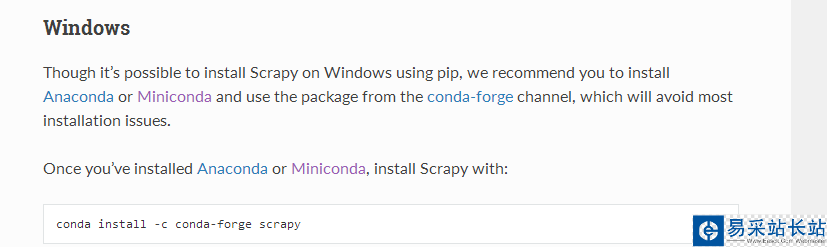 1、找到windows下的框架安裝的文檔教程,這里建議我們安裝Anaconda或者Miniconda集成包,下面我選擇安裝Miniconda安裝包來安裝scrapy框架