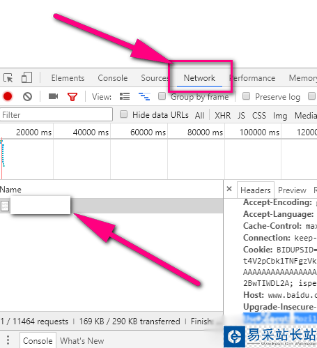 2、打開任意瀏覽器某一頁面(要聯(lián)網(wǎng)),按f12,然后點network,之后再按f5,然后就會看到“name”這里,我們點擊name里面的任意文件即可。