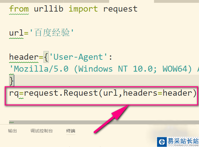5、接著再用Request方法把url和headers組合在一起就可以構(gòu)造一個比較簡單的請求了。Request有三個參數(shù)(url,data,headers),如果有使用data就是post請求了,沒有就是get請求。這里我沒有data,所以我就指定headers=header,不然header就會被當(dāng)成data了。