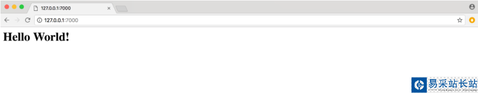 liumiaocn:flask liumiao$ cat flask_1.py #!/usr/bin/pythonfrom flask import Flaskapp = Flask(__name__)@app.route("/")def hello(): return '<!DOCTYPE html> /<html> /<head> /<meta charset="utf-8"> /<title>Hello</title> /</head> /<body>/<h1>Hello World!</h1> /</body>/</html>'if __name__ == "__main__": app.debug=True app.run(host='0.0.0.0',port=7000)liumiaocn:flask liumiao$執行&確認