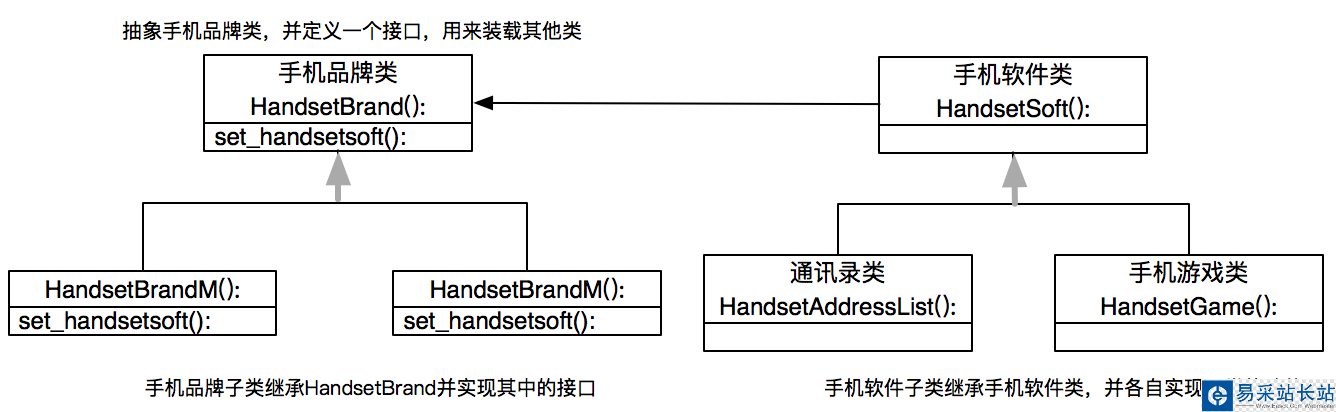 #!/usr/bin/env python# -*- coding:utf-8 -*-__author__ = 'Andy'"""大話設計模式設計模式——橋接模式橋接模式(Bridge Pattern):將抽象部分與它的實現部分分離,使它們都可以獨立地變化.程序實例:手機軟件的分類 和 手機品牌的分類 耦合度低 兩種分類中間用一個set_handsetsoft橋接,各自的變化,不影響其他分類"""# 抽象手機軟件類class HandsetSoft(object): def run(self): pass#具體游戲類,游戲是手機軟件,繼承抽象手機軟件類class HandsetGame(HandsetSoft): def run(self): print "運行手機游戲"#手機通訊錄class HandsetAddressList(HandsetSoft): def run(self): print "運行通信錄"#抽象手機品牌類class HandsetBrand(object): def __init__(self): self.soft = "" def set_handsetsoft(self,soft): self.soft = soft def run(self): pass# 手機品牌Nclass HandsetBrandN(HandsetBrand): def run(self): self.soft.run()# 手機品牌Mclass HandsetBrandM(HandsetBrand): def run(self): self.soft.run()if __name__ == "__main__": game = HandsetGame() address = HandsetAddressList() phoneN = HandsetBrandN() phoneN.set_handsetsoft(game) phoneN.run() phoneM = HandsetBrandM() phoneM.set_handsetsoft(address) phoneM.run()