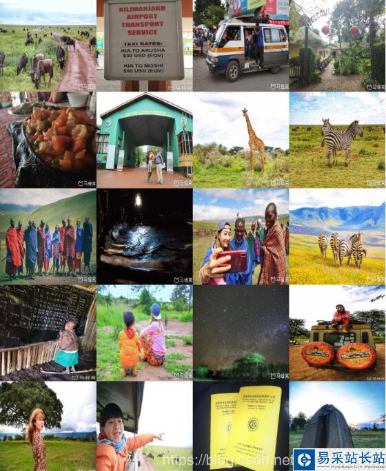 import PIL.Image as Imageimport os IMAGES_PATH = 'D:/Mafengwo/photo/五月坦桑的暖風,非洲原野的呼喚//' # 圖片集地址IMAGES_FORMAT = ['.jpg', '.JPG'] # 圖片格式IMAGE_SIZE = 256 # 每張小圖片的大小IMAGE_ROW = 5 # 圖片間隔,也就是合并成一張圖后,一共有幾行IMAGE_COLUMN = 4 # 圖片間隔,也就是合并成一張圖后,一共有幾列IMAGE_SAVE_PATH = 'final.jpg' # 圖片轉換后的地址 # 獲取圖片集地址下的所有圖片名稱image_names = [name for name in os.listdir(IMAGES_PATH) for item in IMAGES_FORMAT if os.path.splitext(name)[1] == item] # 簡單的對于參數的設定和實際圖片集的大小進行數量判斷if len(image_names) != IMAGE_ROW * IMAGE_COLUMN: raise ValueError("合成圖片的參數和要求的數量不能匹配!") # 定義圖像拼接函數def image_compose(): to_image = Image.new('RGB', (IMAGE_COLUMN * IMAGE_SIZE, IMAGE_ROW * IMAGE_SIZE)) #創建一個新圖 # 循環遍歷,把每張圖片按順序粘貼到對應位置上 for y in range(1, IMAGE_ROW + 1): for x in range(1, IMAGE_COLUMN + 1): from_image = Image.open(IMAGES_PATH + image_names[IMAGE_COLUMN * (y - 1) + x - 1]).resize( (IMAGE_SIZE, IMAGE_SIZE),Image.ANTIALIAS) to_image.paste(from_image, ((x - 1) * IMAGE_SIZE, (y - 1) * IMAGE_SIZE)) return to_image.save(IMAGE_SAVE_PATH) # 保存新圖image_compose() #調用函數前邊設置了很多變量,都很直觀,然后時獲取圖片的名稱以及對需要拼接圖片的數量進行檢查,比如你要拼接5*5的大圖,那就需要25張圖片,最后是我們的主函數,依次遍歷,主要還是利用了Image模塊的強大功能,我們需要做的就是無縫對接。