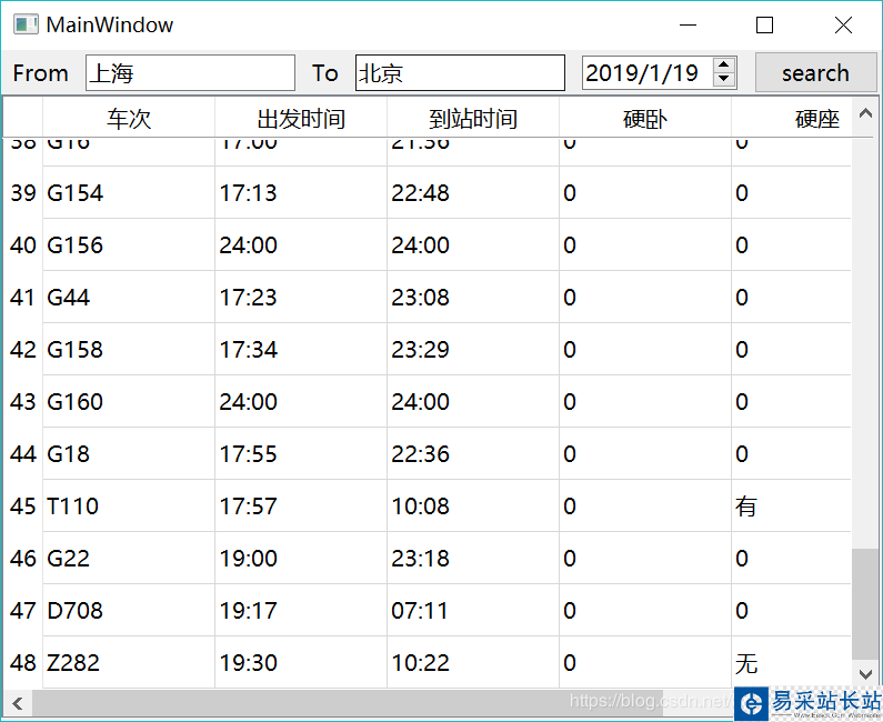 3、槽函數(event.search)調用爬蟲類(TrainService)獲取車次信息,添加到QTableWidget對象中。