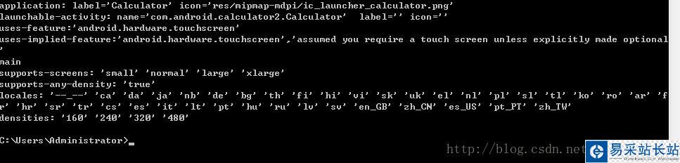 將apk導出后,Android SDK中有一個aapt的工具可以用來查看應用的包名和要啟動的activity名稱,工具在SDK的build-tools目錄下,命令格式為”aapt dump badging apk路徑”