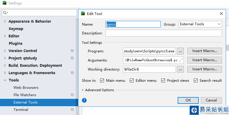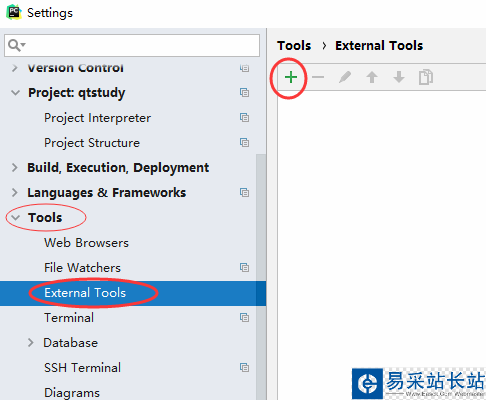 3、以上模塊都安完,設置擴展工具的參數找到setting->tools->external tools,點擊加號新建工具