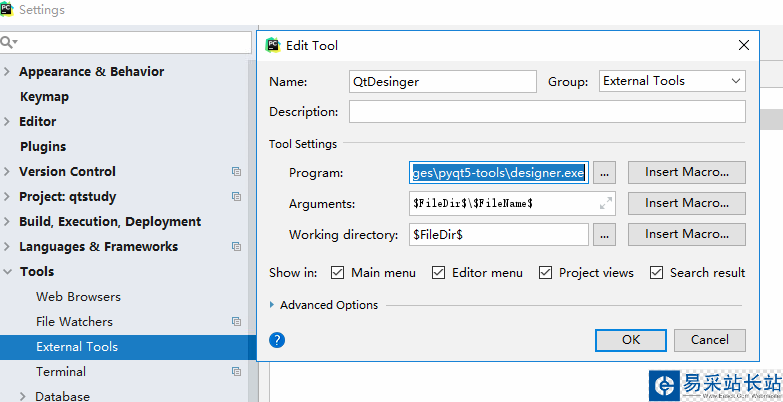 4、先加qtdesinger的參數,program:E:/python_study/qtstudy/venv/Lib/site-packages/pyqt5-tools/designer.exe,這個是我的需要換成你自己的,arguments:$FileDir$/$FileName$ ,working directory:$FileDir$,后面這個可以和我一樣