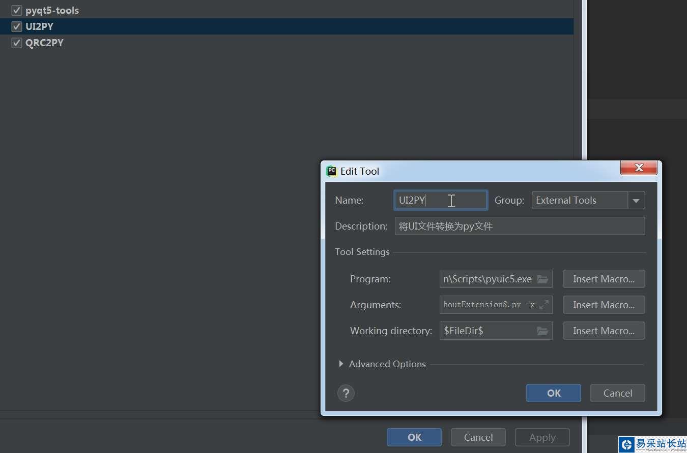 2.Arguments配置為$FileName$ -o $FileNameWithoutExtension$.py -x