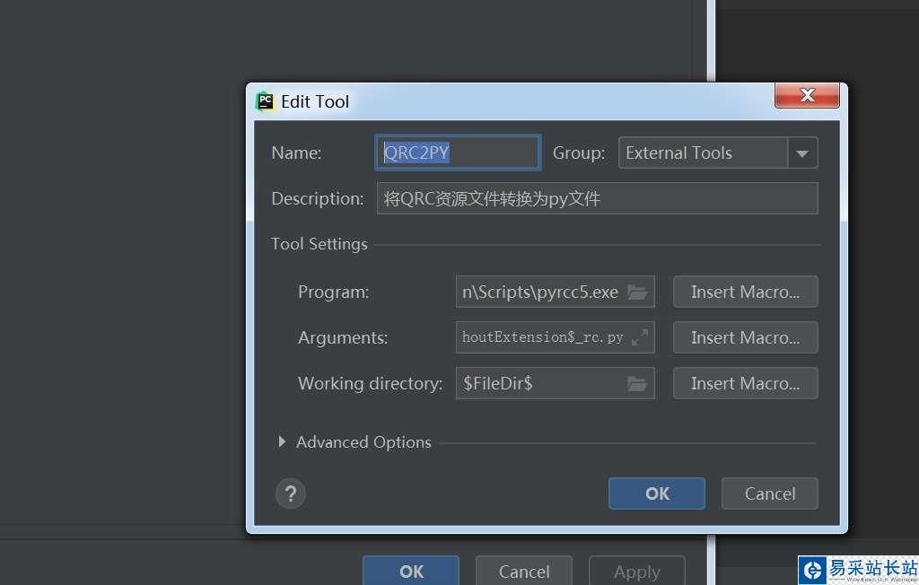2.Arguments配置為$FileName$ -o $FileNameWithoutExtension$_rc.py